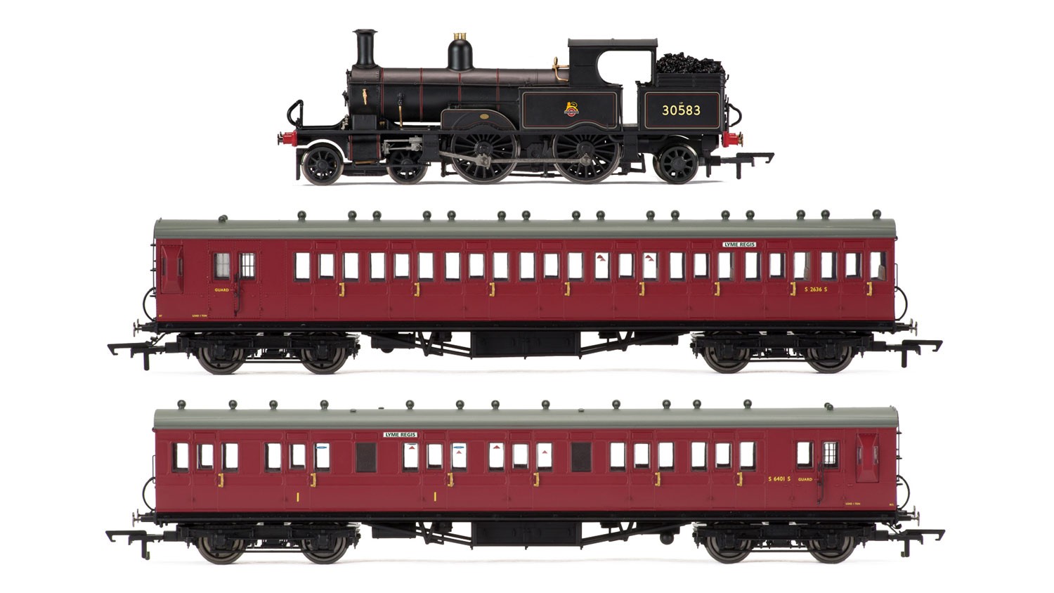 BR BLACK ADAMS RADIAL WITH EARLY CREST,BR EX LSWR NON-CORRIDOR BRAKE COMPOSITE AND A BR EX LSWR NON-CORRIDOR BRAKE 3RD IN MAROON